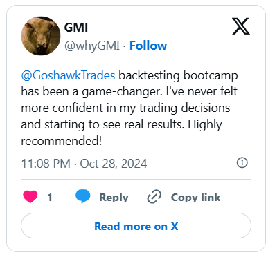 "Proud of making the choice to join the BootCamp.I had no knowledge at all of how to backtest and this is the best investment I have made for my trading."- JB23